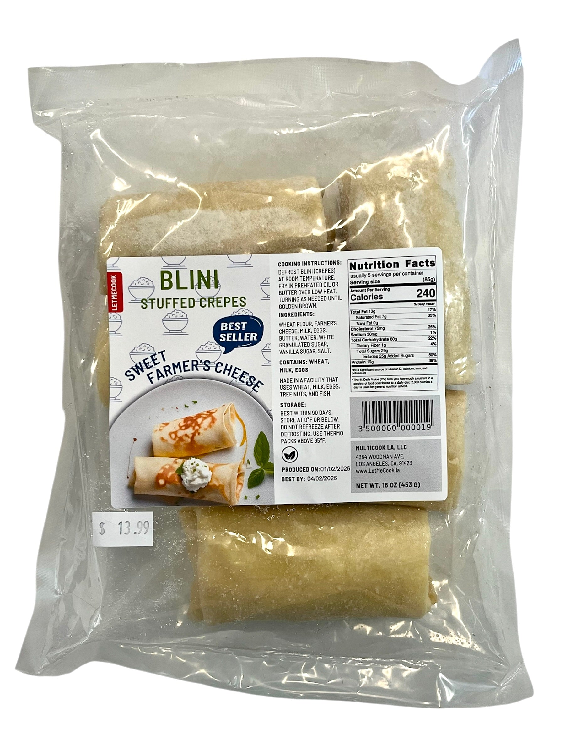 LETMECOOK Blinchiki Sweet Cheese 453 g — Traditional Eastern European-style sweet cheese blinchiki: tender crepe‑like pancakes filled with a creamy sweet cheese mixture. Perfect as a breakfast treat or dessert — heat and serve, then enjoy with sour cream, jam, honey or fresh fruit.