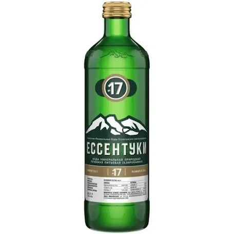 Essentuki 17 is a naturally carbonated mineral water sourced from the Essentuki region in Russia. It is a highly mineralized water, known for its rich content of sodium, chloride, bicarbonate, and boron, making it beneficial for digestion and metabolic health.