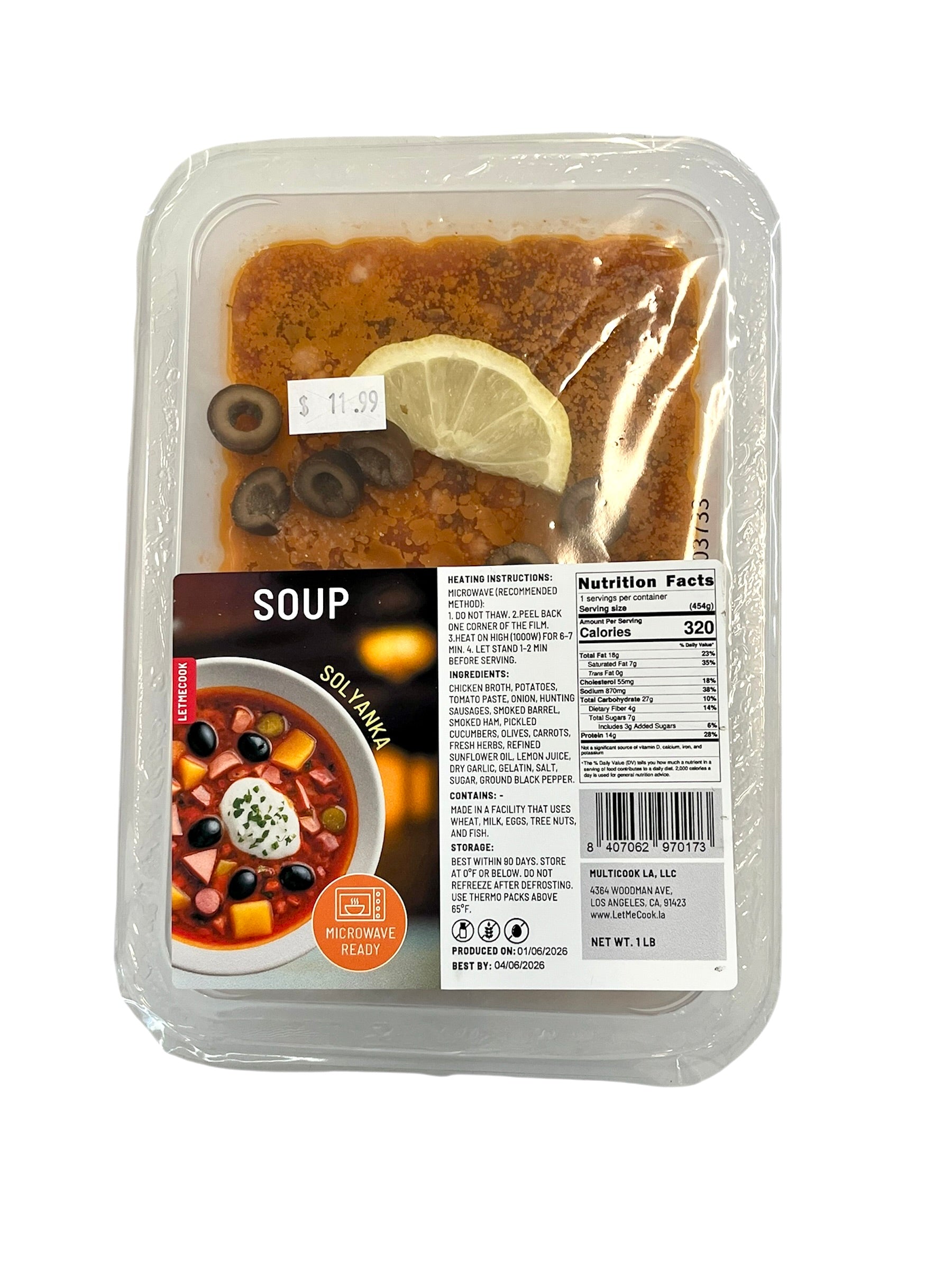 ‘LETMECOOK’ Solyanka 1 lb — Hearty traditional Eastern European soup rich with savory meats, tangy pickles, olives, and aromatic spices in a deep, flavorful broth. Ready to heat and enjoy as a warming meal — best served with a lemon wedge and a dollop of sour cream for classic taste.