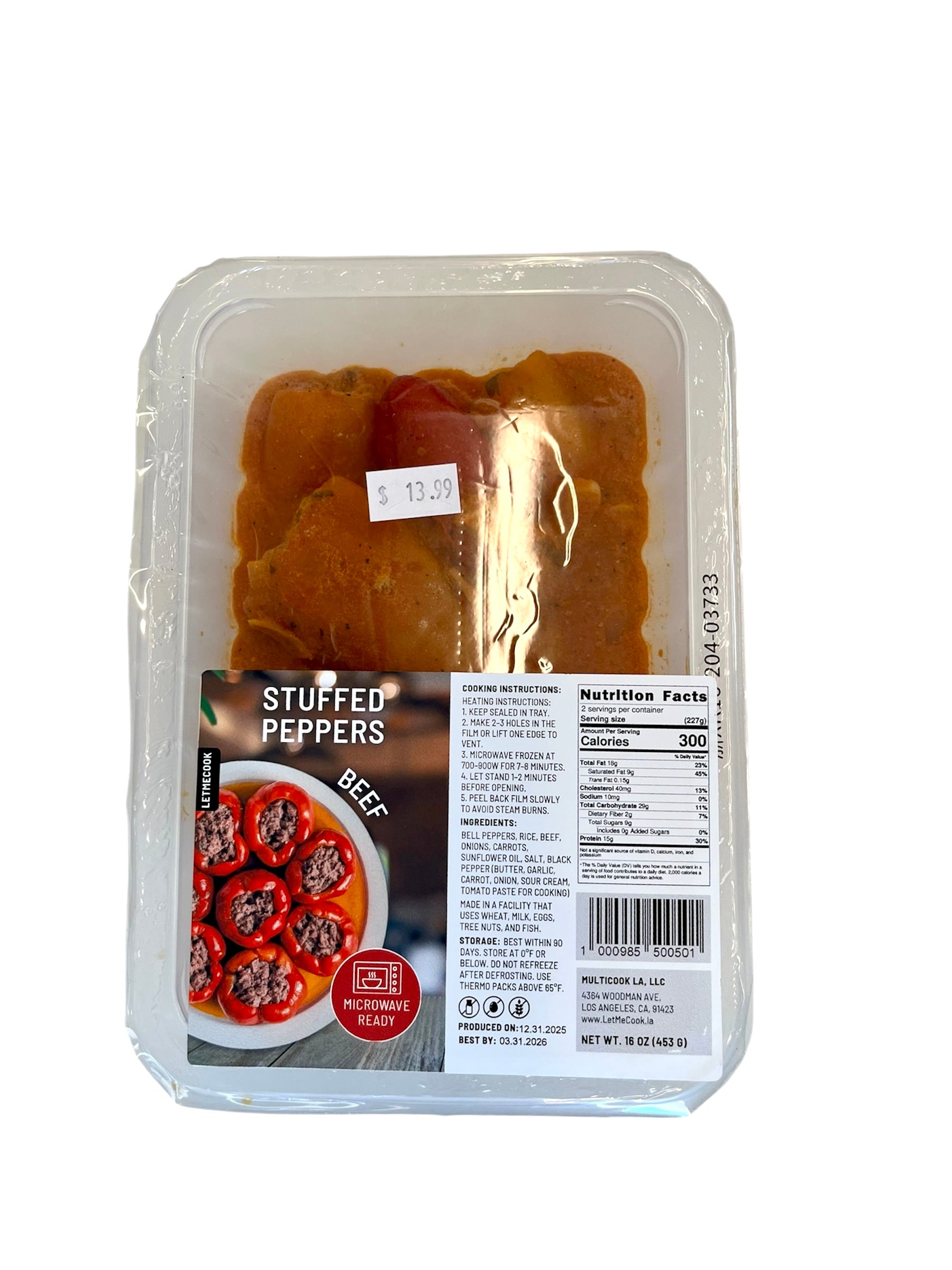 LETMECOOK’ Stuffed Pepper 453 g — Classic tender bell peppers filled with a savory mix of seasoned ground meat and rice, cooked in a rich tomato sauce. A comforting, ready‑to‑heat meal that’s hearty and full of flavor — perfect for lunch or dinner.