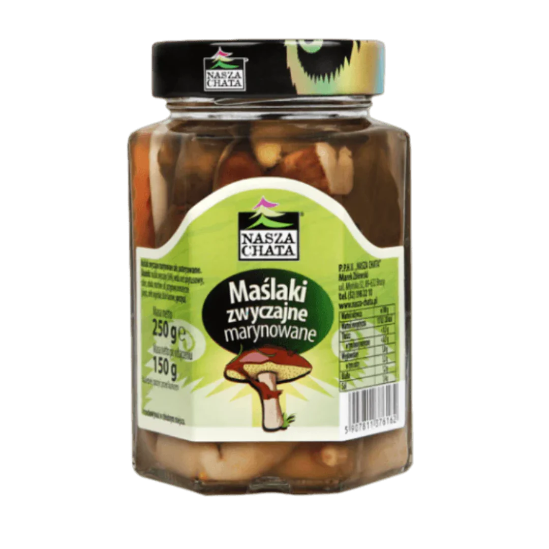 NASZA’ Pickled Slippery Jack (250g) consists of marinated whole Suillus luteus mushrooms, commonly known as Slippery Jack. These mushrooms are carefully selected for their soft texture and mildly sweet flavor. The marinade includes water, spirit vinegar, sugar, onion, carrot, salt, and aromatic spices such as pepper, allspice, bay leaves, and mustard seeds.