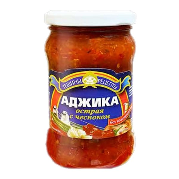 Tescheni Recepti' Adzhika Medium Hot 300g is a jar of flavorful adzhika, a traditional condiment from the Caucasus region. This version is medium-hot, made from a blend of red peppers, garlic, tomatoes, and spices like coriander and dill, offering a balance of heat and rich flavor. The "medium hot" variant provides a manageable level of spiciness that enhances dishes without being overpowering
