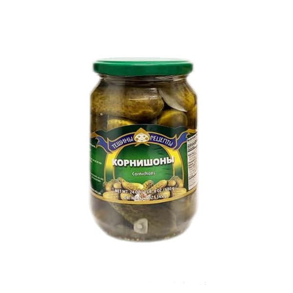 Tescheni Recepti' Pickled Cornichon XL 840g is a jar of extra-large, crunchy cornichons, which are small gherkin cucumbers pickled in a tangy brine. The cornichons are preserved with vinegar, water, salt, and a blend of spices such as dill, garlic, and mustard seeds, providing a sharp, savory, and slightly sour flavor.