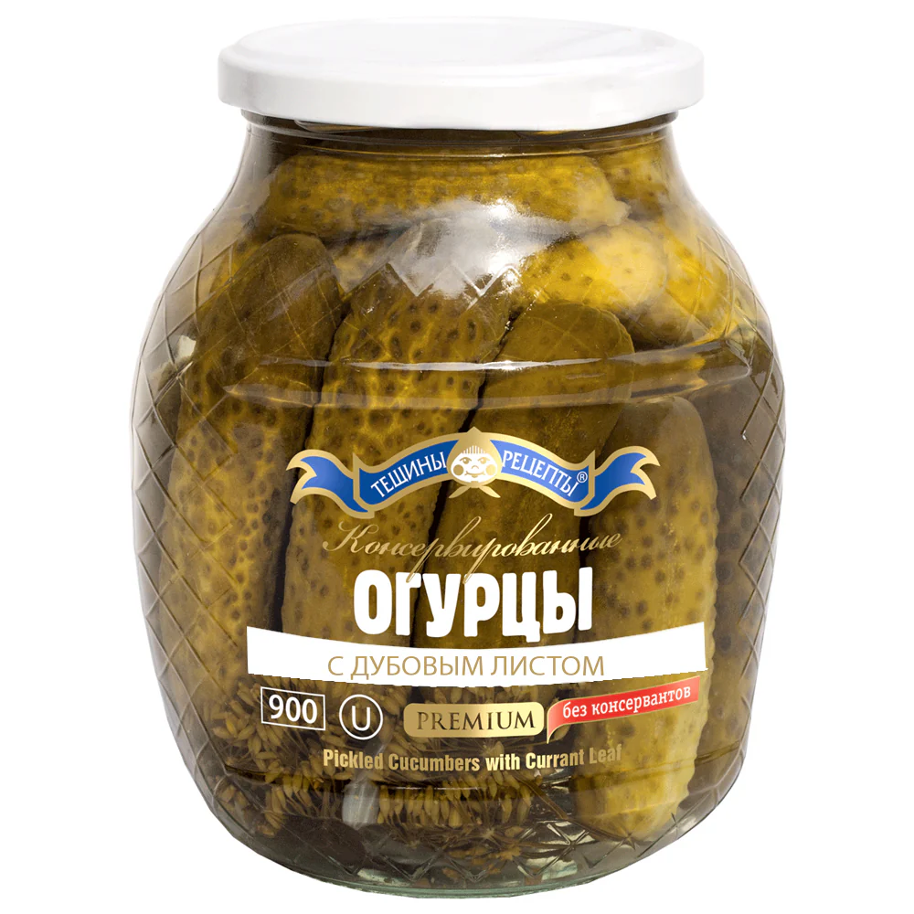 Tescheni Recepti Premium Cucumbers with Oak Leaf (900ml) are lightly pickled cucumbers enhanced with oak leaves, which add a unique flavor and texture. The oak leaves help maintain the cucumbers' crispness and contribute to a slightly more complex, earthy taste in the brine. These cucumbers are pickled in a mild brine with garlic and spices, resulting in a crunchy and flavorful snack or side dish. They are ideal for adding a distinctive touch to sandwiches, salads, or serving as a standalone appetizer.