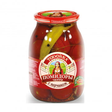 The Todorka Cherry Tomato with Pepper (580g) is a preserved vegetable product featuring whole cherry tomatoes in a brine with peppers, offering a tangy and slightly spicy flavor. It is typically used as a side dish, appetizer, or an addition to salads and main courses.