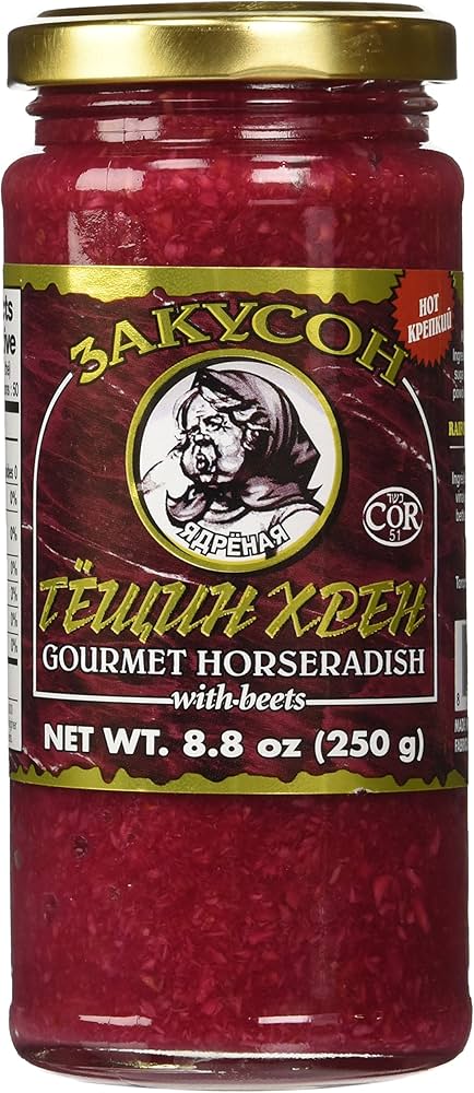 Experience the bold and tangy flavor of Zakuson Horseradish with Beets. This 250g jar combines the zesty heat of horseradish with the natural sweetness of beets, creating a deliciously unique condiment that enhances a variety of dishes.